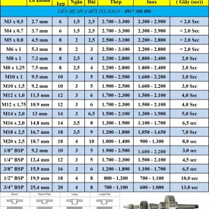 Bảng thông số về kích thước và tốc độ tương ứng dành cho mũi khoan ma sát.